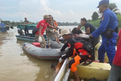 Petugas Pol Air Polres Pelalawan dan petugas gabungan serta masyarakat mengevakuasi korban…