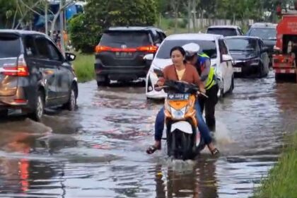 Sat lantas Polres Pelalawan gerak cepat lakukan rekayasa di Ruas Jalan yang Tergenang Banjir