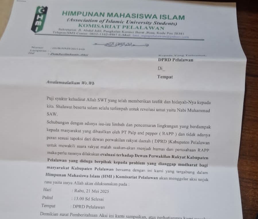 PERSADARIAU, PELALAWAN – Awal pekan ketiga di bulan Mei 2025, Himpunan Mahasiswa Islam (HMI) Komisariat Pelalawan mengeluarkan surat pemberitahuan akan digelarnya aksi unjuk rasa di kantor DRD Pelalawan pada hari Rabu tanggal 21 Mei 2025.