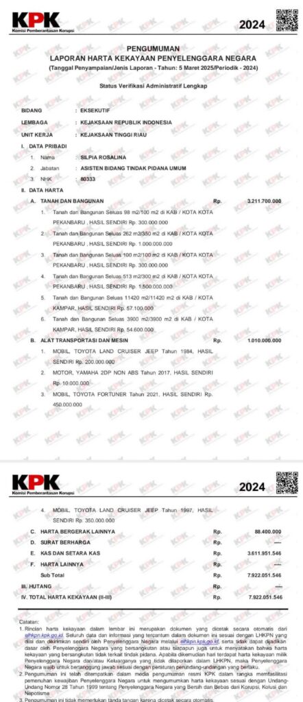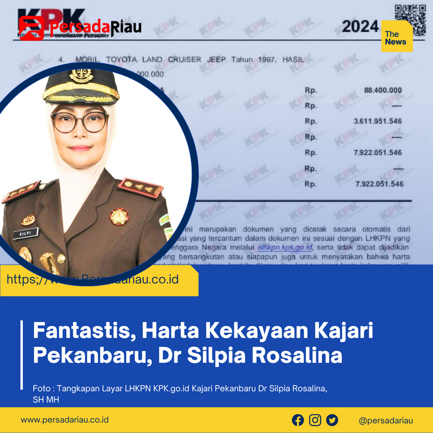 Di Laporan Harta Kekayaan Penyelenggaraan Negara (LHKPN) KPK, Kepala Kejaksaan Negeri Kota Pekanbaru Silpia Rosalina SH MH memiliki harta total Rp 7.922.051.546 tanpa memiliki utang.