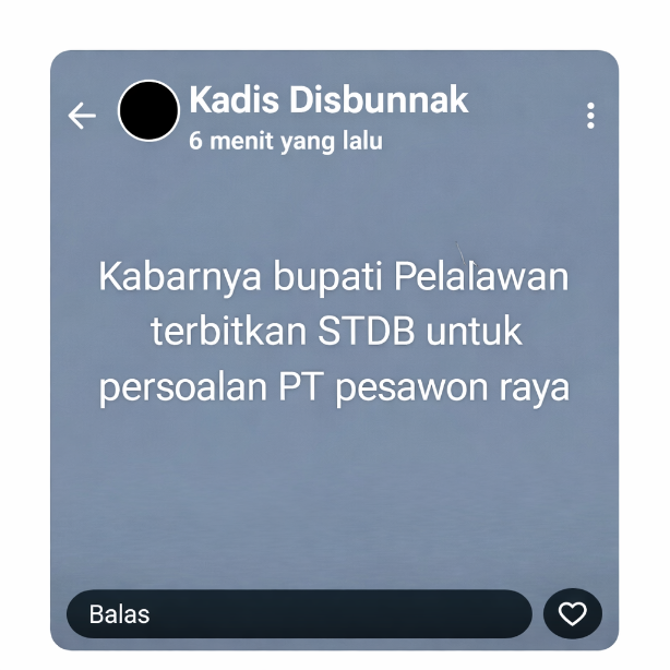 PERSADARIAU, PELALAWAN — Kepala Dinas Perkebunan (Disbun) Kabupaten Pelalawan, Atai, memberikan klarifikasi terkait unggahan di status WhatsApp pribadinya yang sempat menyebut “kabarnya Bupati Pelalawan sudah menerbitkan STDB PT Pesawon Raya”. Unggahan tersebut diketahui telah dihapus tak lama setelah dipublikasikan.