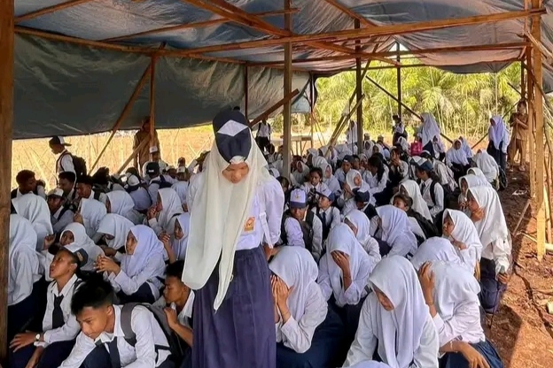 Siswa-siswi SMPN 5 Bonai Darussalam Tetap Bersekolah Meski Hanya Beratapkan Terpal